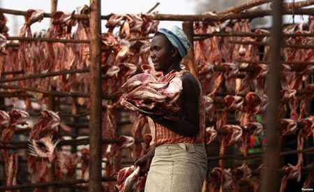 Một người buôn cá đem xương cá ra phơi tại chợ chiên cá "mgongo-wazi" Obunga tại thị trấn Kisumu, Kenya, cách thủ đô Nairobi khoảng 350km.