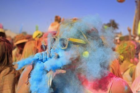 Một cô gái thổi bột màu xanh vào bạn trong lễ hội màu sắc Holi One, thành phố Cape Town, Nam Phi.