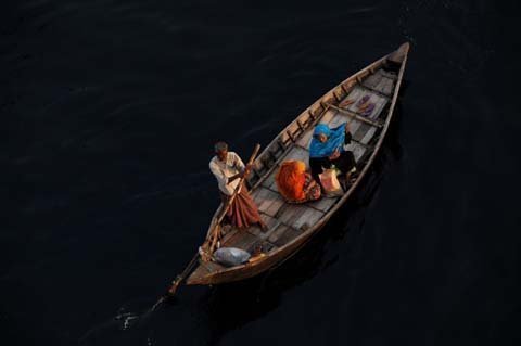 Một người đàn ông chèo thuyền qua dòng nước đen ngòm trên sông Buriganga tại Keranigonj, Dhaka, Bangladesh. (Ảnh: EPA)
