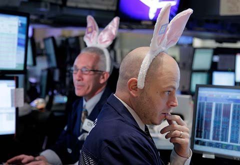 Ngày 5/4, các thương nhân đeo tai thỏ làm việc trên sàn giao dịch chứng khoán New York, Mỹ. (Ảnh: AP)