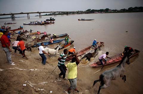 Người chèo thuyền đua với ngựa chạy qua sông ở San Fernando de Apure, Venezuela. (Ảnh: AP)