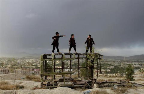 Những cậu bé Afghanistan nô đùa trên một chiếc xe bị phá hủy ở Kabul. (Ảnh: Reuters)