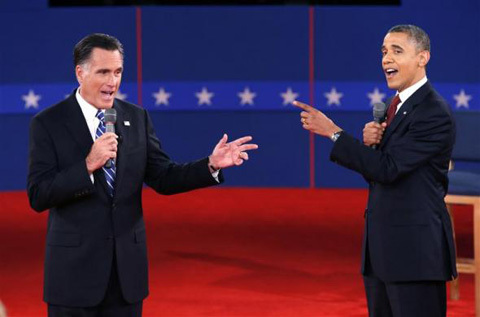 Ngày 16/10, ứng viên đảng Cộng hòa Mitt Romney (trái) và đương kim Tổng thống Mỹ Barack Obama "đấu khẩu" tại buổi tranh luận thứ hai trong cuộc chạy đua vào Nhà Trắng. (Ảnh: Reuters)