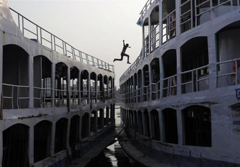 Một người đàn ông nhảy từ chiếc tàu này sang chiếc tàu khác trên sông Buriganga ở Dhaka, Bangladesh. (Ảnh: Reuters)