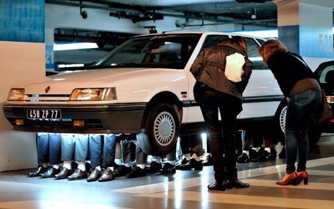 Hai phụ nữ đang chăm chú quan sát màn biểu diễn về giao thông của nghệ sỹ Theo Mercier người Pháp tại một bãi đỗ xe. (Ảnh: Getty Images)
