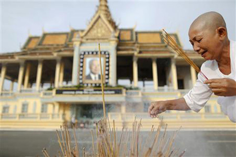 Một hòa thượng thắp hương tưởng nhớ cựu Vương Norodom Sihanouk, người đã từ trần vào rạng sáng ngày 15/10 tại một bệnh viện ở thủ đô Bắc Kinh, Trung Quốc. (Ảnh: Reuters)