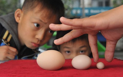 Hai em nhỏ ở Trung Quốc đang chăm chú xem quả trứng gà có đường kính 2cm, nặng 2,6g. Ho Daiyou, chủ nhân của quả trứng này tin rằng nó thậm chí còn nhỏ hơn cả quả trứng nhỏ nhất thế giới. (Ảnh: Quirky China News)