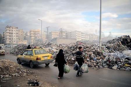 Người dân thành phố Aleppo, Syria mang những chiếc túi tới trước núi rác tại một bùng binh. Hệ thống thu gom rác thải của thành phố đã bị sụp đổ từ nhiều tuần trước. (Ảnh: AP)