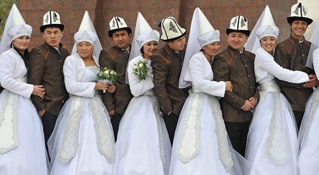 5 cặp vợ chồng tham dự đám cưới tập thể, được một công ty nhà nước tài trợ tại Bishkek, Kyrgyzstan hôm 14/11. (Ảnh: Getty Images)