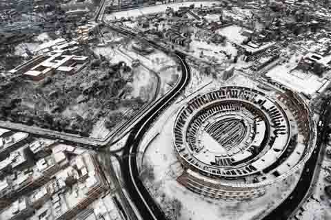 Đấu trường La Mã ở Rome, Italy "khoác" lên mình "chiếc áo tuyết" trắng phau ngày 4/2. Băng tuyết bao phủ và thời tiết giá lạnh đã khiến các nhà chức trách tại Rome phải tạm đóng cửa điểm tham quan hấp dẫn này. (Ảnh: EPA).
