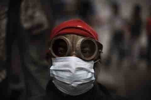 Ngày 6/2, một người biểu tình tại Cairo ngụy trang để tránh đạn hơi cay của cảnh sát chống bạo động. (Ảnh: Getty Images)