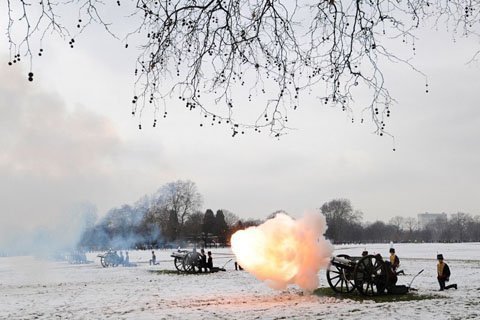 Binh sỹ thuộc đội kỵ binh Hoàng gia Anh bắn đại bác ở công viên Hyde, trung tâm London, khai mạc lễ kỷ niệm 60 ngày lên ngôi của Nữ hoàng Anh Elizabeth II ngày 6/2. (Ảnh: Getty Images)
