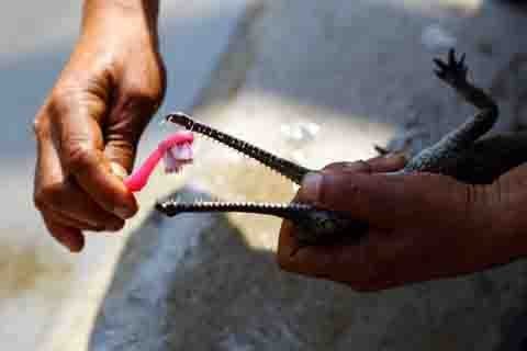 Anh Prem Sharma đến từ Công viên quốc gia Chitwa, tây nam Kathmandu đang chải răng cho con cá sấu con. (Ảnh: Reuters)