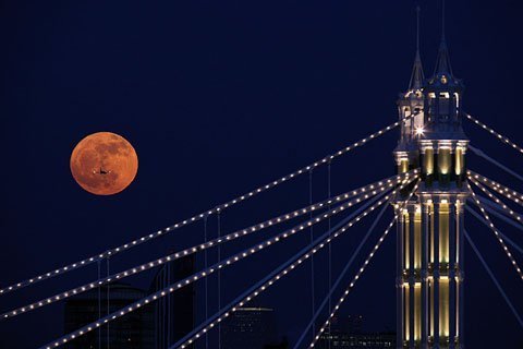 Máy bay "xuyên" mặt trăng tròn vành vạnh tại London, Anh. (Ảnh: Getty Images)