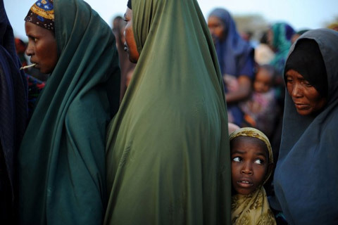 5/7, một bé gái Somali chạy trốn bạo lực và hạn hán đang xếp hàng bên ngoài điểm phân phát lương thực trong trại tị nạn Dadaab, Bắc Kenya.