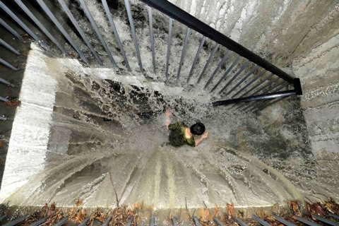 3/7, một người dân chạy trên những bậc thang tràn nước do trận lụt khủng khiếp tại Thành Đô, Tứ Xuyên, Trung Quốc. Toàn bộ hệ thống giao thông của thành phố bị tê liệt vì lụt.