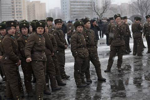 Binh sĩ Triều Tiên đứng dọc một con đường ở Bình Nhưỡng trong tuyết rơi dày ngày