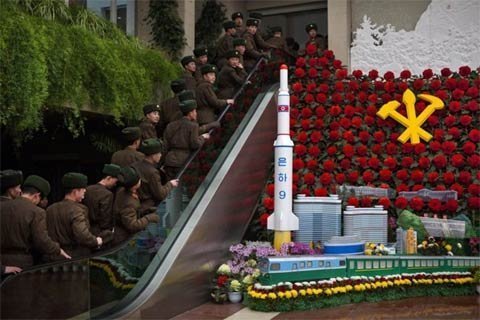 Binh sĩ Triều Tiên đi cầu thang di động qua một mô hình Tên lửa Unha khi họ tới
