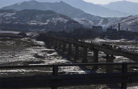 Người dân đi trên một cây cầu đường sắt bắc qua sông ở phía nam núi Myohyang và