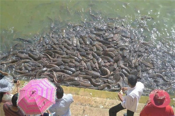 Cảnh tượng đàn cá đông như kiến tấp nập bơi đến gần bờ để tranh giành thức ăn từ những vị khách du lịch.