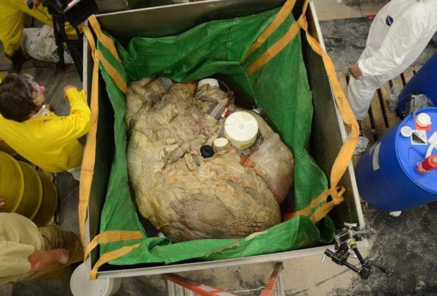 Trước khi có câu trả lời nhiều người sẽ thắc mắc và không biết đây là gì. Đây chính là trái tim của một con cá voi xanh. Một quả tim của con vật này có thể nặng tới gần 2 tạ, và đương nhiên phải vài người hợp sức mới khiêng được. Tính ra nó nặng tương đương một chiếc lốp xe kéo lớn đấy!