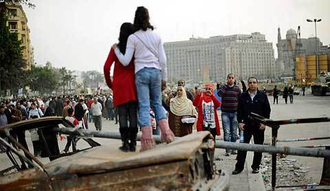 Người biểu tình chụp ảnh kỷ niệm trên mui một chiếc xe bị phá hỏng ở Quảng trường Tahrir. Tình hình ở Ai Cập tiếp tục căng thẳng khi Tổng thống Hosni Mubarak quyết không nhượng bộ yêu sách đòi ông từ chức của phe đối lập. (Ảnh: Reuters)