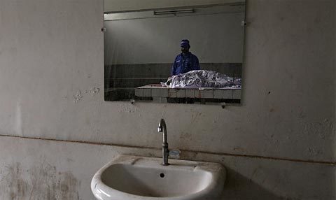 Một nhân viên hỗ trợ cứu thương đứng cạnh xác một người Hy Lạp trong một nhà xác ở Karachi, Pakistan. Cảnh sát cho hay, người đàn ông này tên là Imeridis, có một vết thương ở gáy và nhiều khả năng đã bị giết chết. Vụ việc đang được điều tra. (Ảnh: Reuters)
