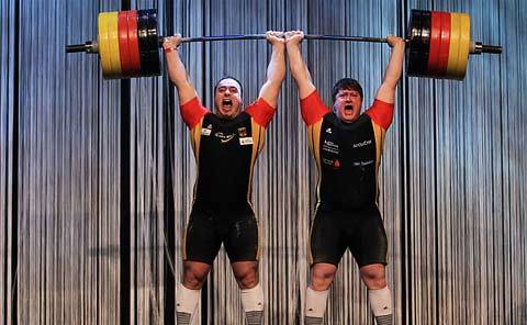 Hai vận động viên cử tạ của Đức đã lập kỷ lục thế giới mới khi nâng 330kg trên cùng một thanh tạ ở Sports Gala 2011 'Ball des Sports' tại Wiesbaden, Đức. (Ảnh: Getty)
