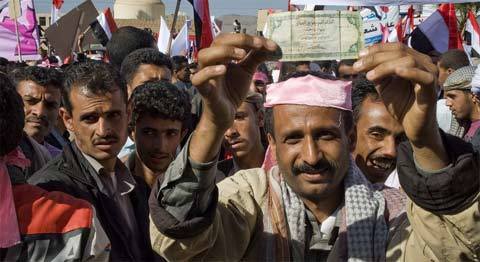 Theo gót làn sóng biểu tình của người Tunisia và Ai Cập, lực lượng đối lập ở Yemen cũng huy động người ủng hộ xuống đường phố phản đối chính quyền của Tổng thống Saleh. (Ảnh: BBC)