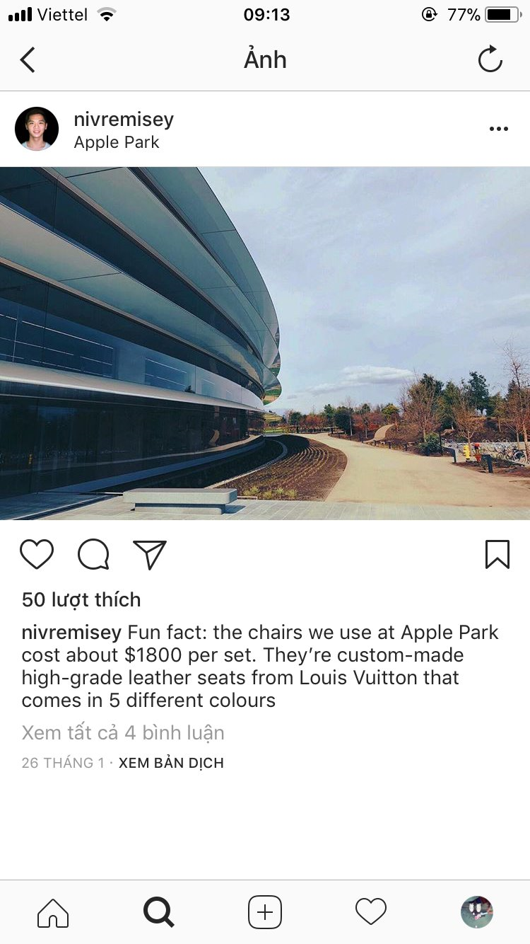 Một trong số nhân viên đã viết: "Sự thật thú vị: chiếc ghế mà chúng tôi sử dụng tại Apple Park giá khoảng 1.800 USD / bộ. Đây là những chiếc ghế da cao cấp từ Louis Vuitton với 5 màu khác nhau"