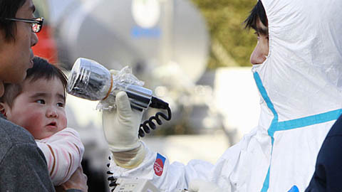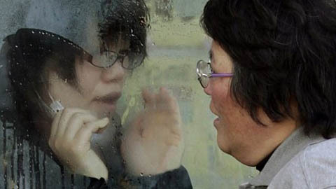 3.Một bà mẹ đang cố nói chuyện với con gái của mình đang bị cách ly vì nhiễm phóng xạ sau khi được sơ tán khỏi khu vực xung quanh nhà máy điện hạt nhân Fukushima.