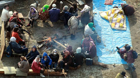 4. Những người may mắn sống sót đang ngồi quanh đống lửa và chờ sự giúp đỡ tại lều trú tạm gần Ishinomaki.