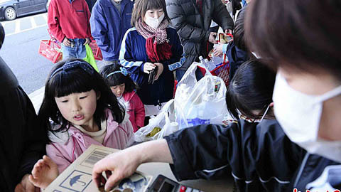 5. Người dân ở Fukushima xếp hàng tại cửa siêu thị để mua thức ăn và nước uống.