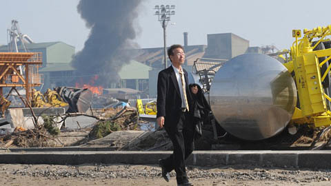 13. Một người đàn ông mặc comple bước đi ung dung trước khung cảnh hoang tàn tại Sendai
