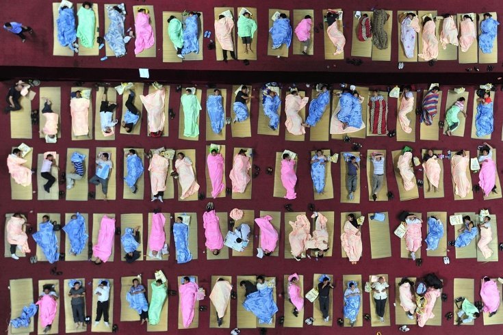 Phụ huynh tân sinh viên ngủ trên sàn phòng tập thể chất tại Đại học Huazhong, Wuhan, Tỉnh Hubei, Trung Quốc. Khoảng 600 phụ huynh đã được nhà trường cấp chăn chiếu khi họ theo con em mình tới nhập học.