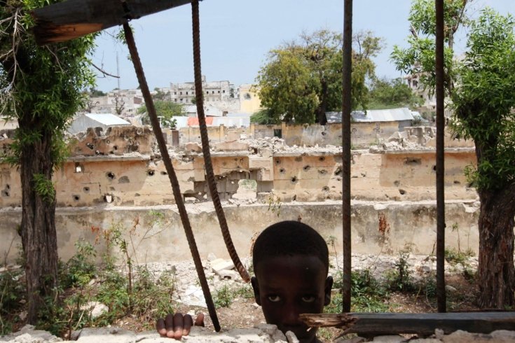 Một cậu bé đói cồn cào đứng bên khu nhà bị tàn phá bởi chiến tranh ở Mogadishu, Somalia.