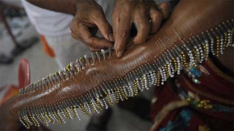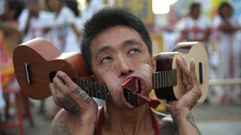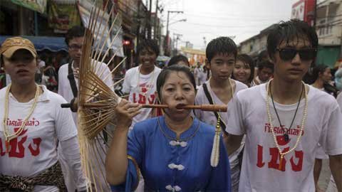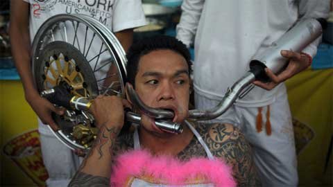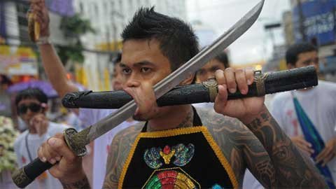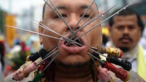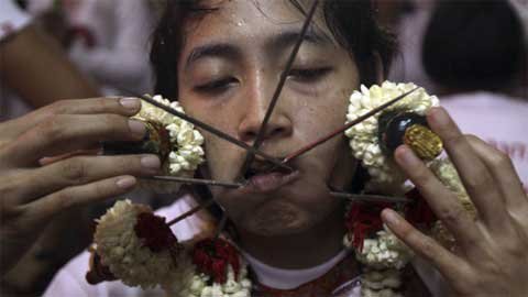 Trong lễ hội ăn chay ở Phuket, miền nam Thái Lan, những người mộ đạo đã xiên mình bằng gươm, chọc thủng má bằng các vật nhọn và làm nhiều việc gây đau đớn khác để gột sạch tội lỗi của bản thân và cộng đồng.