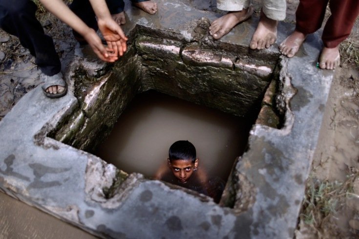 10/4, một cậu bé Pakistan ngâm mình trong bể chứa nước để chống chọi với nhiệt độ tăng cao, những người khác đang đợi đến lượt mình. Ảnh Getty