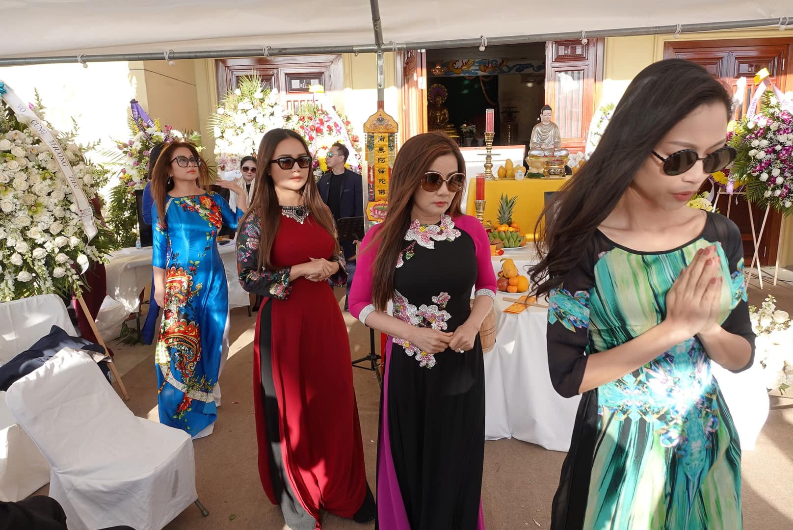 Các nghệ sĩ "trình diễn thời trang" áo dài trước linh cữu nhà thiết kế.