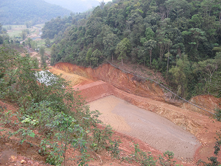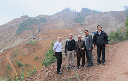 | GS Đặng Hùng Võ (giữa) cùng đoàni khảo sát tại đỉnh núi “tan hoang” ở mỏ sắt Pù Ổ. Nước thải của khai trường, đặc biệt là khi mưa lũ, bùn đất sẽ chảy vào gây ra bồi lắng đáng sợ cho hồ Ba Bể. |