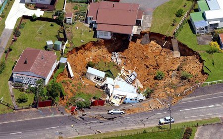Một ngôi nhà tại Waihi, New Zealand đã rơi xuống một hố khổng lồ rộng chừng 50m và sâu 15m vào tháng 12 năm 2001. Rất may 5 người sống trong căn hộ này, trong đó có 3 em nhỏ đều được an toàn. (Ảnh: AP)