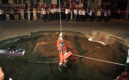 Một nhân viên cứu hộ đang tìm cách di chuyển xuống hố tử thần sâu 10m trên một con phố ở Cáp Nhĩ Tân, Trung Quốc vào tháng 8 năm 2012. Hai người đã thiệt mạng và 2 người khác bị thương trong vụ sụt lún này. (Ảnh: Quirky China News)