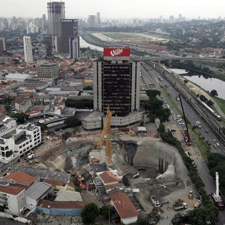 Vào tháng 1 năm 2007, một hố khổng lồ đã xuất hiện tại công trường xây dựng ga tàu điện ngầm Pinheiros ở Sao Paulo, Brazil. Các nhà chức trách cho biết một chiếc xe chở khách loại nhỏ đã bị rơi xuống chiếc hố sâu tới 40m này. (Ảnh: Getty Images)