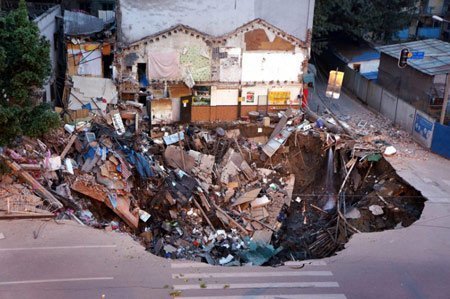 Tháng 5 năm 2010, một hố sụt khổng lồ, gần như vòng tròn hoàn hảo, rộng chừng 20m và sâu khoảng 30m, đột nhiên xuất hiện và "nuốt chửng" một tòa nhà ba tầng cùng một căn hộ tại thành phố Guatemala. Các nhà chức trách đổ lỗi cho mưa lớn từ trận bão nhiệt đới Agatha đã tạo ra hố tử thần này. (Ảnh: AP)