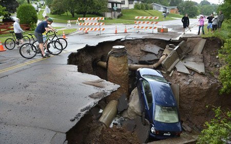 Một chiếc xe hơi nằm lọt thỏm trong một chiếc hố khổng lồ tại Duluth, Minnesota sau trận lũ quét gây ra bởi cơn mưa xối xả. (Ảnh: AP)