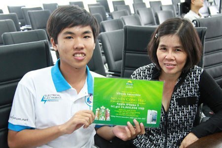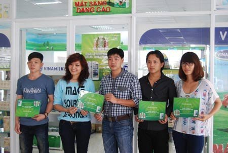 | Ông Nguyễn Quốc Huy, Trưởng bộ phận Marketing ngành hàng nước giải khát Vfresh - Vinamilk trao thưởng cho khách hàng trúng giải điện thoại iPhone 5 |