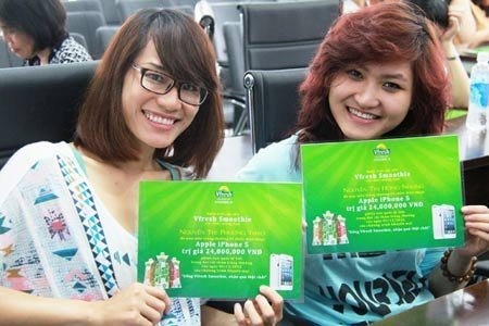 Để trúng chiếc điện thoại iPhone 5, bạn chỉ cần mua các sản phẩm nước trái cây sữa Vfresh Smoothie sản xuất sau ngày 17/10/2012 để có ngay mã dự thưởng tham gia đăng ký chương trình rút thăm trúng thưởng và để sở hữu vòng tay USB 2G sành điệu bạn chỉ cần thu thập đủ 40 bộ nắp sản phẩm.