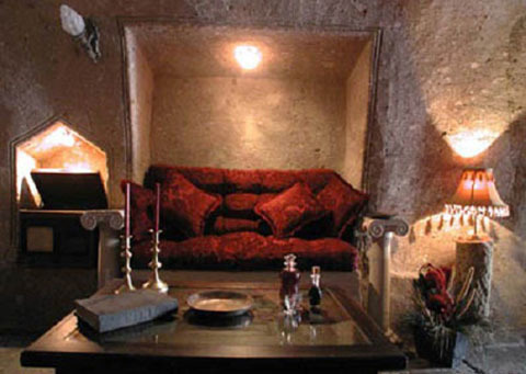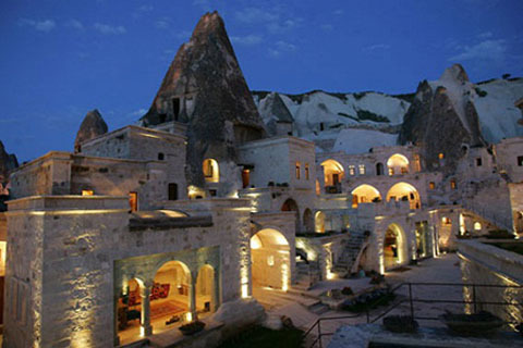 Khách sạn dạng hang động này xuất hiện hầu hết trong thành phố Cappadocia, được xây dựng sâu trong núi đá lửa mềm với những bức tường đá rắn chắc nên các phòng của khách sạn cách âm cách nhiệt tốt, rất thanh tịnh. Tất cả các khách sạn ở đây rất sang trọng, mọi lối ra vào đều trải thảm. Chỉ một đêm trong khách sạn hang động này cũng đủ làm bạn lạc vào thế giới thần tiên.