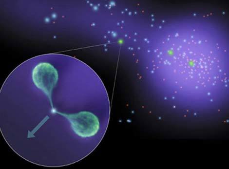 Qua những hình ảnh gửi về từ kính thiên văn vũ trụ Spitzer của NASA, các nhà khoa học đã phát hiện thấy một hệ thiên hà có hình thủ rất kỳ lạ. Thiên hà bao gồm một điểm trung tâm nối hai ‘hòn đảo’ thiên hà với nhau. Đặc điểm của trung tâm kết nối này là phát ra ánh sáng rất mạnh, giống như một cây hải đăng trên biển.