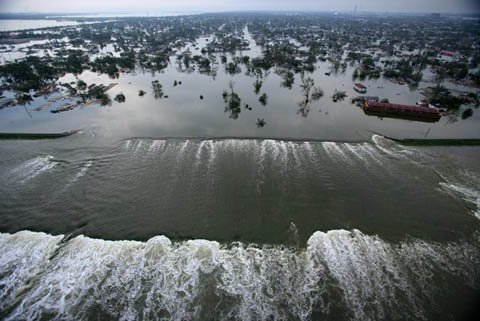 Nước lũ từ cơn bão Katrina tràn qua một con đê dọc kênh đào Inner Harbor Navigation gần thị trấn New Orleans, Los Angeles, ngày 30/8/2005, một ngày sau khi Katrina quét qua thành phố. (Ảnh: AP)